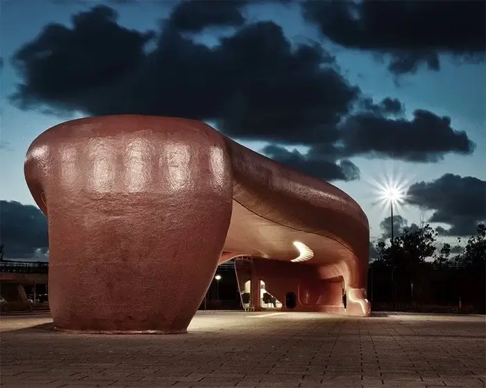 Форма викликає різні асоціації: для когось це гігантський камінь, для інших — паща кита. І все це — результат обмеженого бюджету та сміливого мислення.
