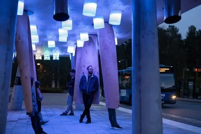 Щоб не пропустити автобус, зупинка використовує звуки та кольорові сигнали. Кожен маршрут має свій звук: наприклад, автобус до склозаводу супроводжується м’яким дзвоном скла. Уся конструкція виконана з дерева.